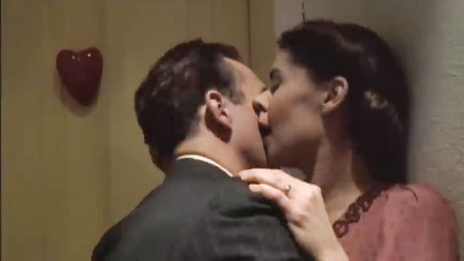 When the housewife hands the groom (her landlady's daughter's new husband) his letter delivered by the postman, he begins kissing her hand and then he kisses her (26:15). They are interrupted by someone.