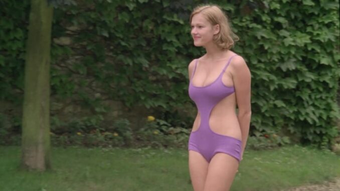 Brigitte Lahaie cheats on her boyfriend (or husband) with the butler, does some sneaking around to screw him. The bulk of their interaction starts at around 30:15.
